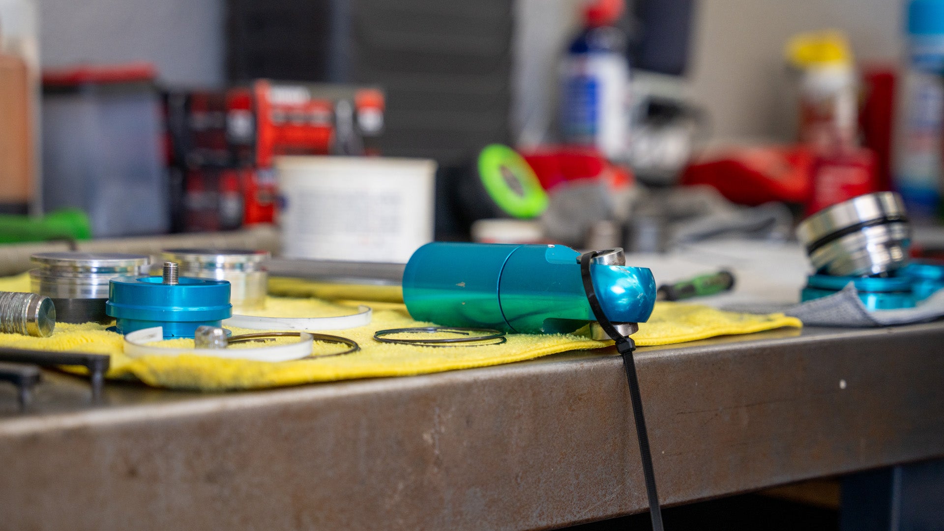 Once cleaned, we fully disassemble each shock by hand. Internal parts